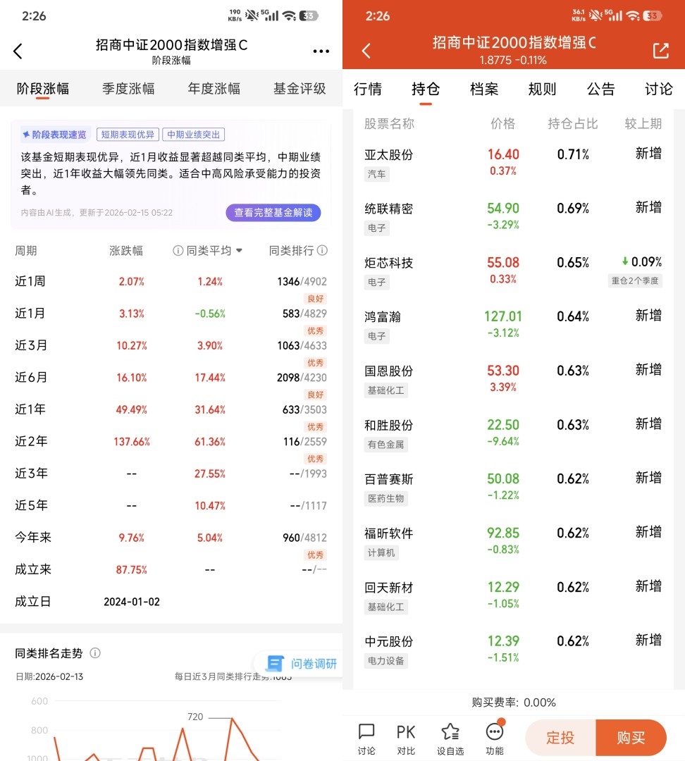 我手里拿着招商中证2000指数增强C(019919)已经大半年了,今年以来收益9.76%,近一年49.49%,成立以来87.75%。今天就跟大家掏心窝子聊聊,我为什么在这个位置,依然看好这只基金,以及接下来怎么操作。