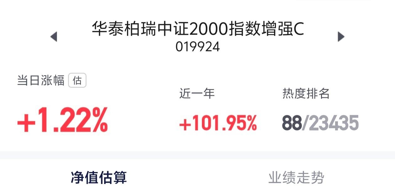 $华泰柏瑞中证2000指数增强C$ 小盘股今天再次领跑!华泰中证2000指增估值上涨,近一年收益101.95%,表现惊艳!