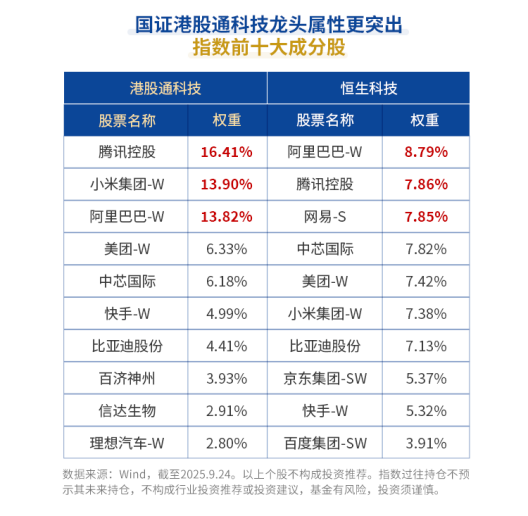 根据指数编制规则,国证港股通科技指数(987008)单只成分股权重上限15%,恒生科技单只成分股比重上限8%,而龙头股在“政策驱动+盈利改善”双重利好下,或更具反弹优势。