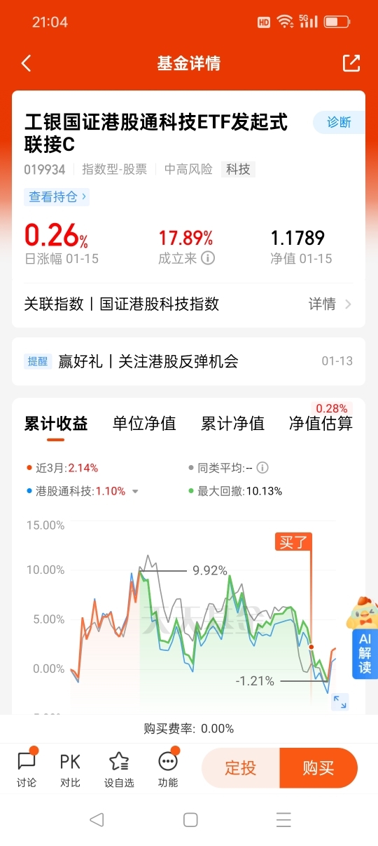 我看好港股反弹机会,今天继续反弹。我从上周二开始定投的$工银国证港股通科技ETF
