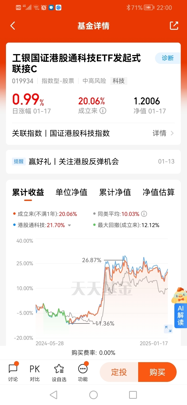 #关注港股反弹#+打卡第15天,我看好港股通科技,近期港股反弹,看好$工银国证港股通科技ETF发起式联接C$ ,目前估值低,收益不错!工银国证港股通科技ETF联接基金有助于把握港股核心资产,尤其是科技龙头的投资机遇。此基金标的指数-港股通科技指数,超越恒生科技等同类科技主题指数,配置价值凸显。基金经理赵栩,16年证券从业经历,管理能力强,精通港股科技,在管基金业绩优秀,这只基金小伙伴多加关注!@工银瑞信基金