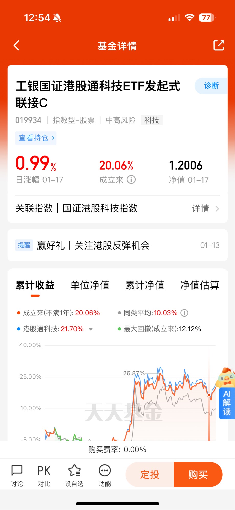 打卡第11天,工银国证港股通科技ETF发起式联接C,成立以来涨幅20.06%。主