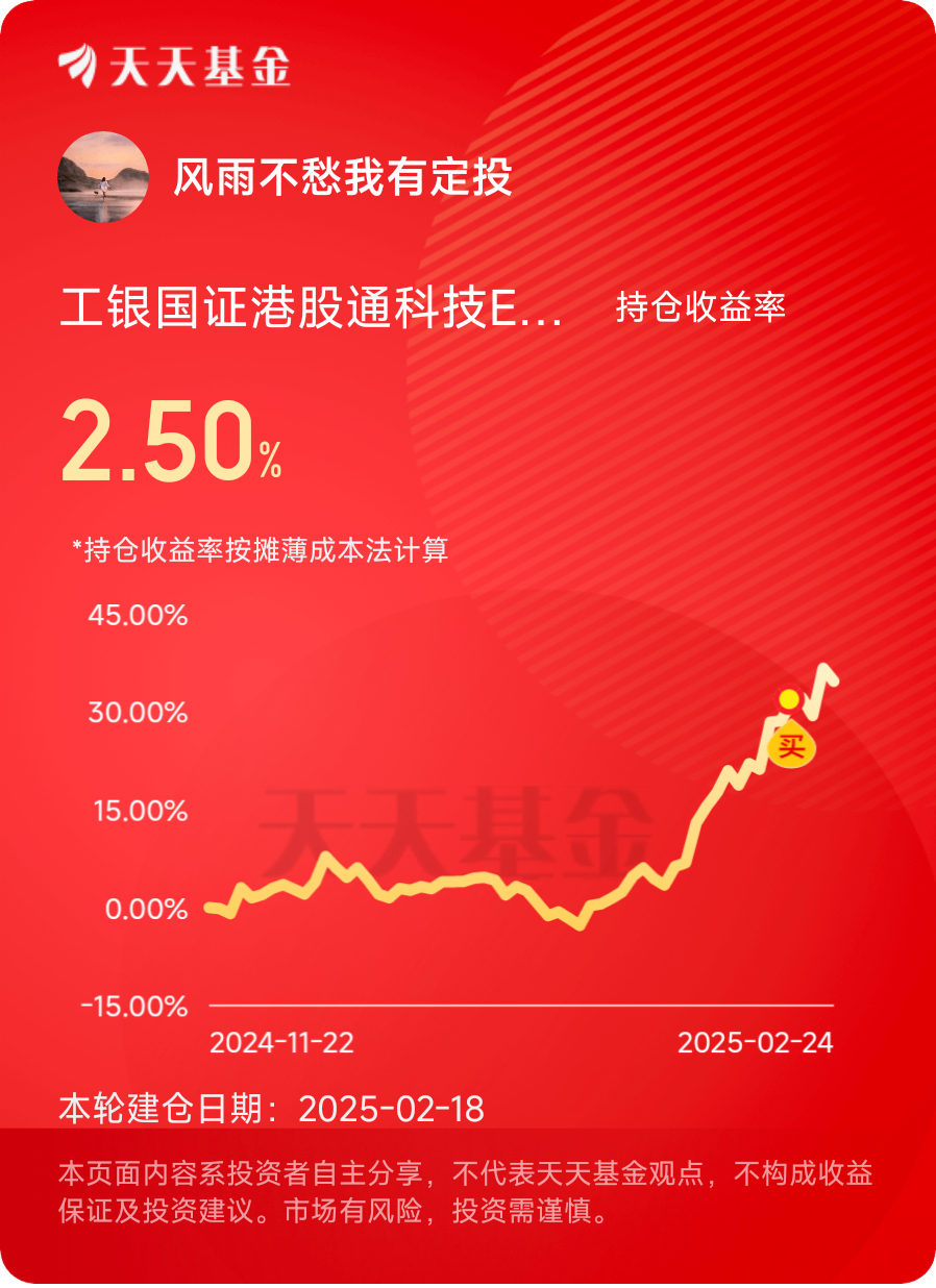 #开工啦,我的投资新启航# 打卡第33天,工银瑞信国证港股通科技指数基金聚焦于港股市场中的科技领域,其成分股是具有代表性的科技企业,分布在信息技术、生物科技、先进制造等多个子领域。这些企业在港股市场中占据重要地位,具有较高的成长潜力。由于科技行业处于快速发展阶段。以半导体行业为例,港股中的相关企业受益于行业需求增长与技术升级,不断创新。像中芯国际等企业,在晶圆代工领域技术不断突破,市场份额逐步扩大,展现出强大竞争力。相较于其他一些科技类指数,它具有鲜明对比优势。某些指数可能选取范围广且分散,该指数则聚焦于港股通的科技股,更能体现港股特色。一些内地科技企业在港股上市的特殊优势,如国际化估值体系,使其价值在国证港股通科技指数中能更精准展现。政策鼓励科技企业发展,国际市场对中国科技资产需求增加。估值方面,部分企业因市场波动被低估,此时布局正当时。该基金手续费更低、追踪效果更好。低手续费能增加投资回报,追踪效果好可确保资产配置贴合指数表现。定投参与,可平滑市场波动风险,适合长期投资,投资者可积极关注。