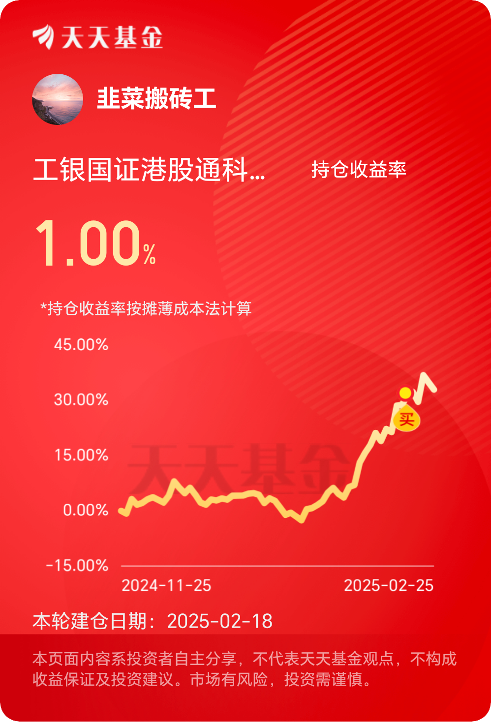 #开工啦,我的投资新启航# 打卡第34天,工银瑞信国证港股通科技指数基金,简单来说,是追踪国证港股通科技指数的基金。该指数主要聚焦港股市场,选取了在港股上市的、代表科技行业发展的优质企业样本,这些样本企业主要集中在信息技术、互联网、生物科技等多个前沿科技领域。港股汇聚了腾讯、阿里巴巴等行业巨头,这些公司在全球互联网行业都具有极高的知名度和强大的竞争力,它们的持续发展能推动指数稳步上升。相较于其他指数,国证港股通科技指数具有独特优势。它聚焦于港股科技股,近年来香港市场不断优化上市制度,吸引了更多优质科技企业赴港上市,丰富了指数样本,提升了指数的代表性和投资价值。国家对科技创新大力支持,港股市场的国际化和开放程度高,海外资金源源不断流入,为港股科技股提供了良好的发展机遇。一些新兴的生物科技公司得益于政策扶持,在港股市场快速成长。目前港股科技股整体估值处于历史相对低位,不少企业的盈利增长潜力巨大。随着研发成果的陆续释放,公司价值有望进一步提升。该基金手续费更低、追踪效果更好,定投能让投资者平滑投资成本、降低市场波动风险,分享港股科技的发展红利。
