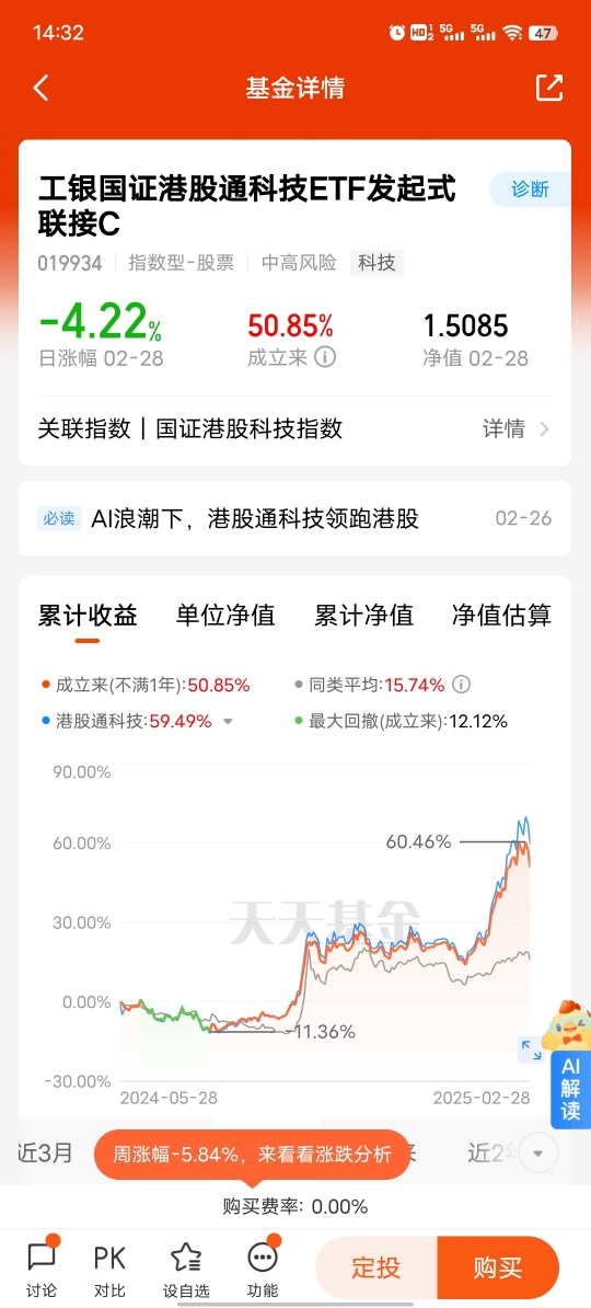打卡第二天,$工银国证港股通科技ETF发起式联接C$与国证港股科技指数相关联,国