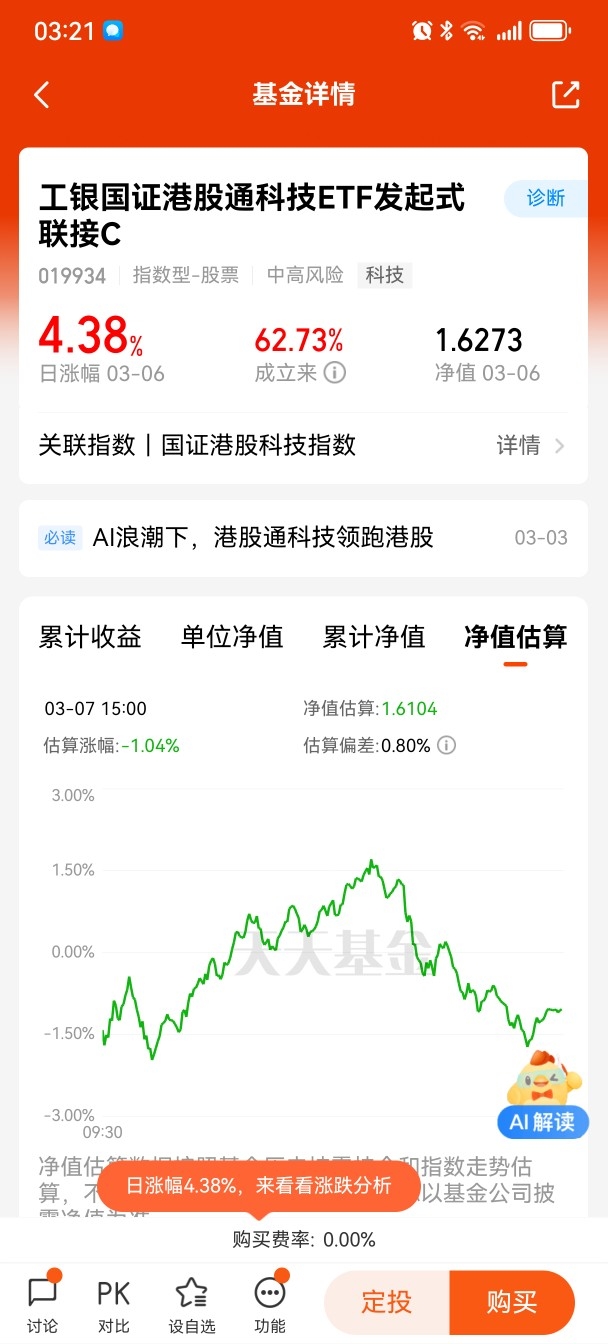 #港股通科技领跑港股#今时今日,AI火爆全网。近期,在Deepseek的大模型催化下,更是摧枯拉朽,科技板块走出了一骑绝尘之势头。在科技板块的热潮中,港股通科技又独领风骚,远远跑赢了港股。港股通科技为指数基金,工银国证港股通科技ETF发起式联接基金近6个月收益率67.49%,可谓红的发紫,赚的让人幸福得有些眩晕。它选取的都是港股新经济中核心资产的代表,行业上涵盖了电子、传媒、生物科技等企业。如果你也看好科技浪潮,如果你强烈认同未来是科技的天下,然而又不知道买什么的话,不妨赶紧关注这只基金吧!