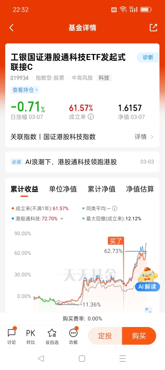 #港股通科技领跑港股# 今天港股震荡回落,下周大概还会继续涨!$工银国证港股通科技ETF发起式联接C$聚焦科技互联网龙头,是布局港股科技牛市投资机会的优选!近三个月上涨32.64%,在3265只同类基金中排名前1%,表现非常优异!