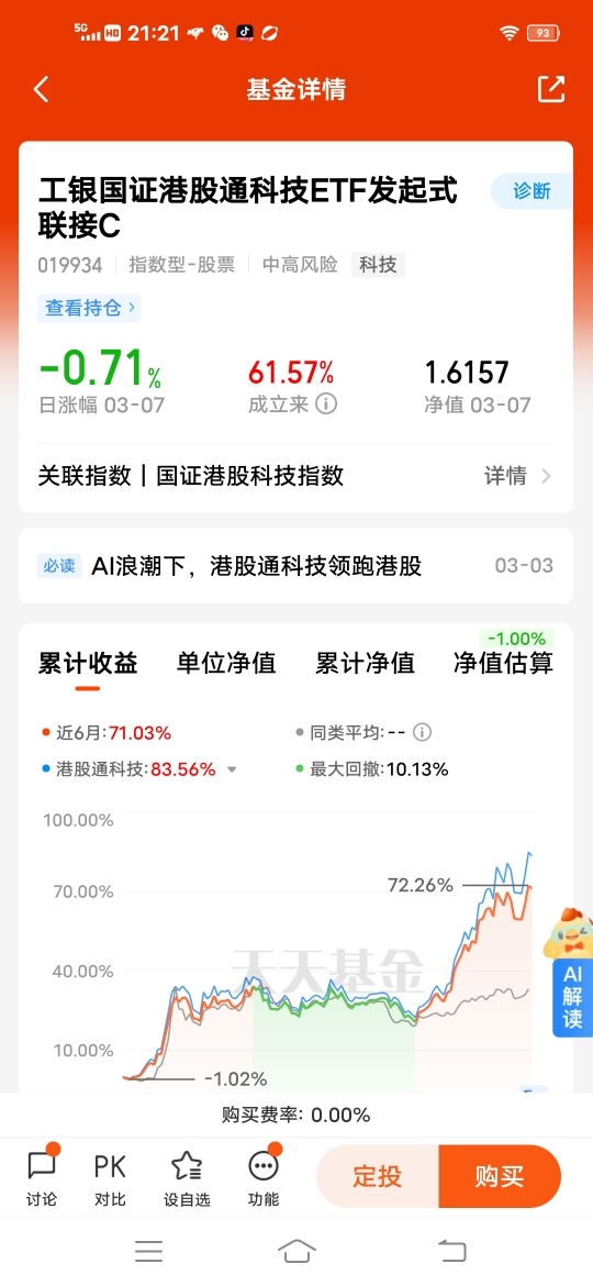 打卡第十天,布局港股科技牛市行情,就选$工银国证港股通科技ETF发起式联接C$,