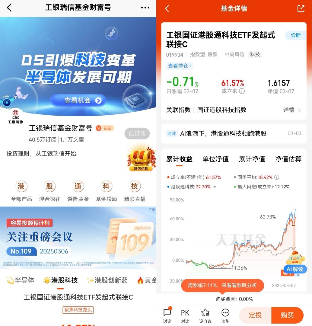 #港股通科技领跑港股#+AI浪潮来袭,给国产科技带来了更为强力可持续的活水,港股科技近期表现是非常亮眼的,同时也获得了资金的持续青睐,南向资金今年以来大军进军港股,光是上个月的南向资金净流入就达到了1528亿港元。但是由于科技板块也会有细分行业,那在表现上就会有差别,国证港股通科技指数在一众港股科技指数中,表现不错,行业覆盖到电子、传媒、生物科技行业,在把握当下科技牛市中有显著优势,值得我们关注。$工银国证港股通科技ETF发起式联接C$#晒收益# 在跌的时候买入后,现已拿下了7.20%的收益,还是蛮不错的,同时有政策的持续支持,后续相信还会有更加强劲的业绩表现展现,坐等在港股通科技里喝酒吃肉!@工银瑞信基金