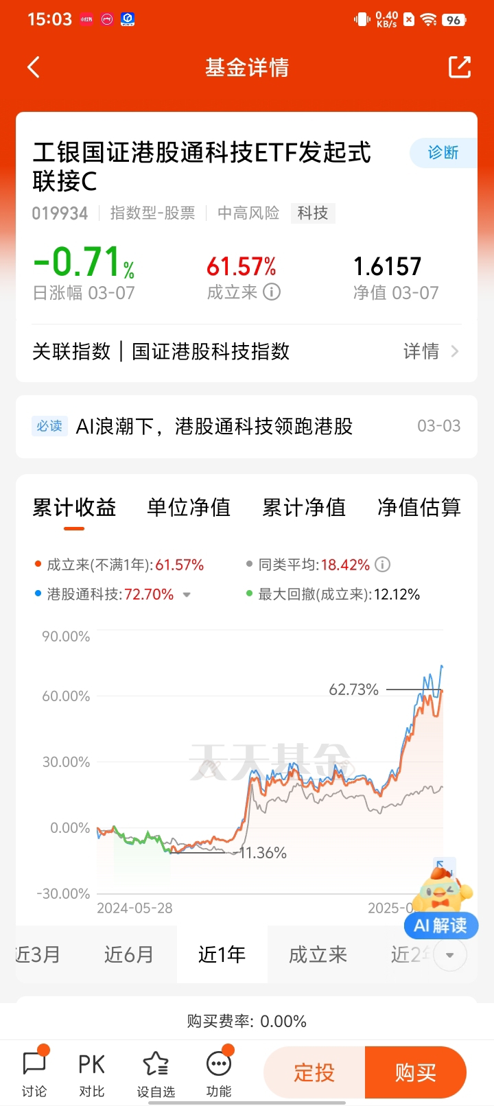 工银国证港股通科技ETF发起式联接C近6月以来获得71.03%的回报,同期同类平均33.21%,同期业绩比较基准43.87%,获得了不错的超额收益,表现还是非常不错的。在DeepSeek概念行情火热的当下,是时候采取行动了。通过投资工银国证港股通科技ETF发起式联接C基金,不仅能够紧跟港股科技发展的步伐,还能在DeepSeek等热门概念的推动下,实现财富的稳健增长。@工银瑞信基金