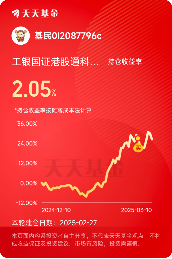 未来,随着AI技术的进一步普及和应用,港股科技板块的成长潜力将更加凸显。选择工银国证港股通科技ETF发起式联接C,或许是把握这一时代机遇的重要一步。#晒收益#