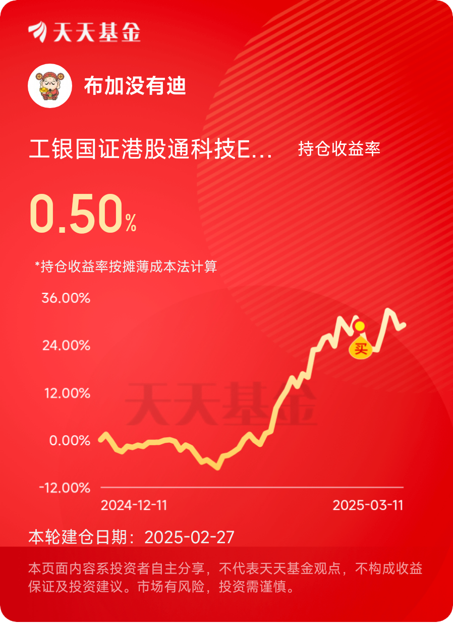 #港股通科技领跑港股#打卡第十五天。截至2025年3月11日,工银国证港股通科技ETF发起式联接C最新净值为1.5825,日涨幅为0.66% 。近1个月波动13.65%,近3个月波动29.03%,近6个月波动67.73%,近12个月波动58.25%。
