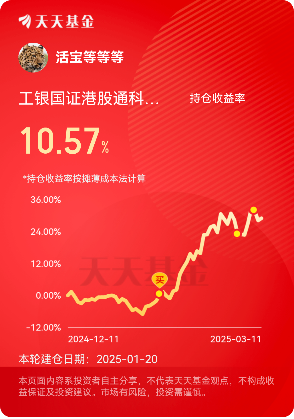 #港股通科技领跑港股#打卡第15天,3月11日,工银国证港股通科技ETF发起式联接C的表现较为平稳,其跟踪的国证港股通科技指数当日下跌0.29%,但整体仍处于近期的上涨趋势中。从近期表现来看,该基金近1月涨幅达17.09%,近3月涨幅达32.64%,显著优于同类平均和沪深300指数,显示出较强的市场竞争力。其跟踪的国证港股通科技指数成分股涵盖了互联网、生物科技、大数据等科技细分领域,具有较高的成长性和投资价值。尽管短期内市场波动在所难免,但从长期来看,随着港股市场的估值修复以及科技板块的持续发展,该基金有望为投资者带来可观的收益,适合看好港股科技板块且风险承受能力较高的投资者。@工银瑞信基金 #晒收益#