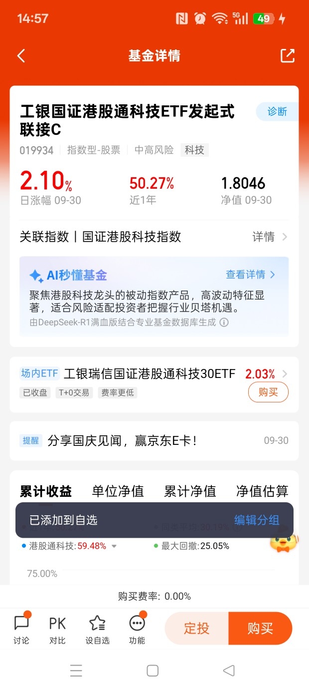 #分享国庆见闻,晒收益,瓜分好礼!# 这个国庆长假,我最大的感慨就是“科技改变生活”。在大城市的街头巷尾,无人驾驶、智慧安检、智慧城市、移动支付、新能源、无人机、人形机器人等,各种高科技应用可谓是越来越广泛了,所以投资的角度看,这就是今年科技板块大崛起的原因吧。科技发展是永恒的,接下来我们的投资也要尽量多关注科技行业。而投资科技的话,大家不妨关注下$工银国证港股通科技ETF发起式联接C$ ,作为专业投资科技板块的基金,他们具有专业分析能力和投资经验,比我们盲目区投资更有优势。@工银瑞信基金