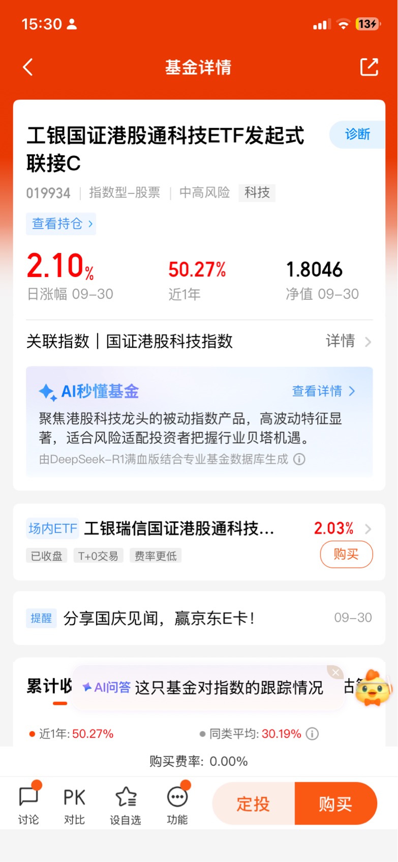 #分享国庆见闻,晒收益,瓜分好礼!# 留言第七天,万里江山披锦绣,千秋华夏奏华章,祝祖国繁荣昌盛!也祝伙伴们天天赚钱!昨天A股港股又涨了,开心呀。$工银国证港股通科技ETF发起式联接C$ 涨2.1%,近一年收益率50.27%,在3053只同类基金中排名前列,给力!