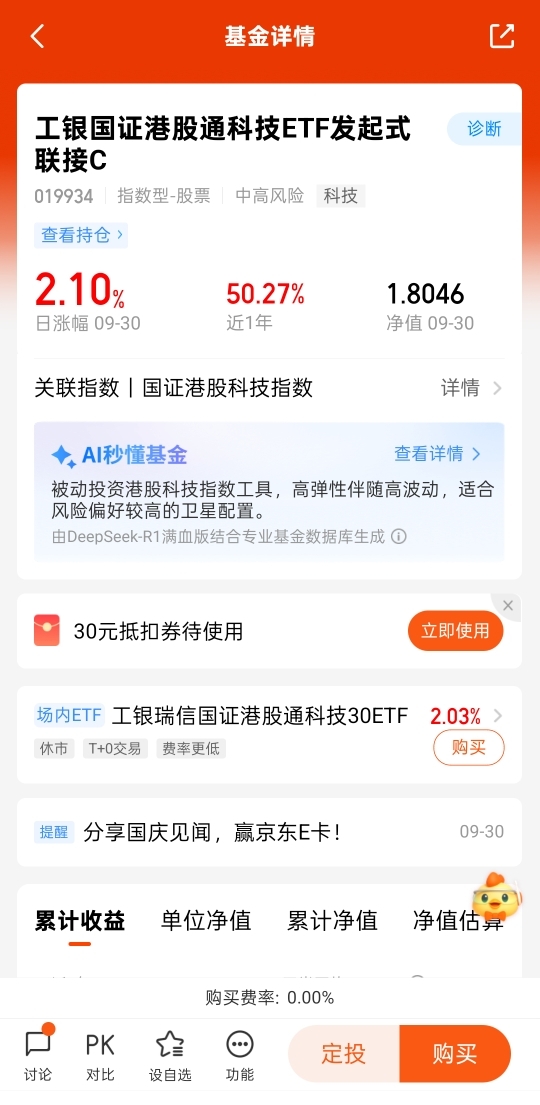 #分享国庆见闻,晒收益,瓜分好礼!# 进入10月份,全球市场继续上涨,科技板块表现亮眼,港股科技更是涨势如虹,我持有的$工银国证港股通科技ETF发起式联接C$ ,虽然持有时间短,但是收益率不错。此基金在4345只同类基金中排名前10%,表现非常优秀!