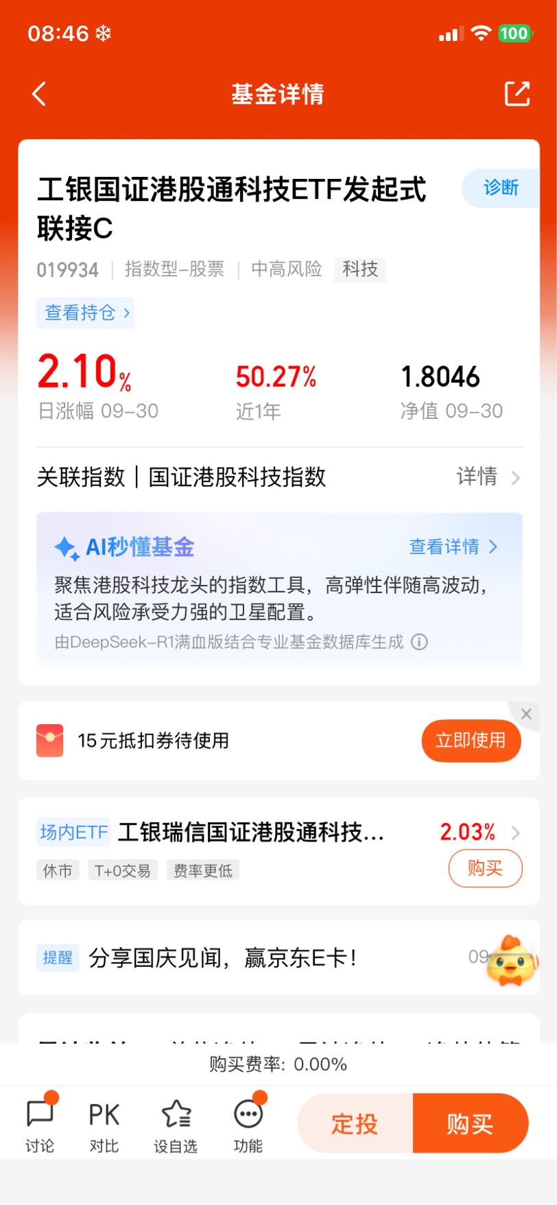 留言第十天,$工银国证港股通科技ETF发起式联接C$,综合费率低,申购赎回交易便