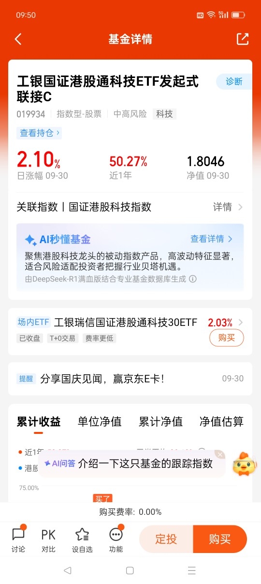 2025年最后三个月,我的投资规划是:继续买入$工银国证港股通科技ETF发起式联接C$,并坚定持有。这只指数基金近一年收益回报50.27%,近一个月收益回报13.55%(同类基金平均值4.71%),在4345只同类基金中排名前10%,非常亮眼!我还会继续定投工银瑞信基金的其它产品,并长期持有,以获得更好的收益回报!