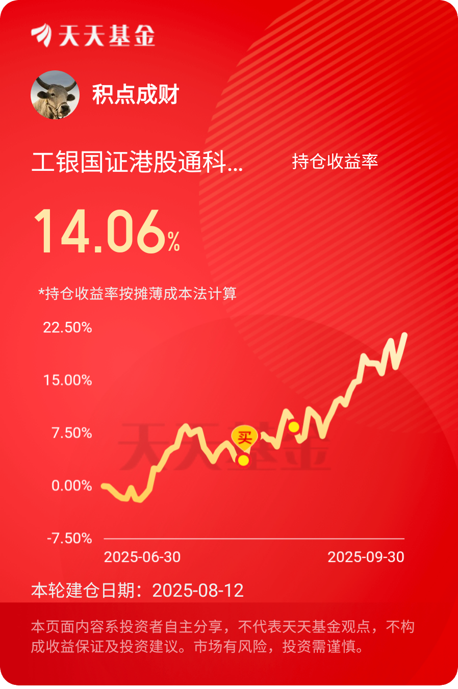 $工银国证港股通科技ETF发起式联接C(019934)$ 紧密跟踪国证港股通科技指数,一键布局,低费便捷,省心省力。本基金近1年收益率达到50.27%,近几个月震荡调整,9月份开始,上涨明显,似有向上发力的趋势。2025年最后三个月,我将坚定持有,择机加仓,看好其后续表现! @工银瑞信基金