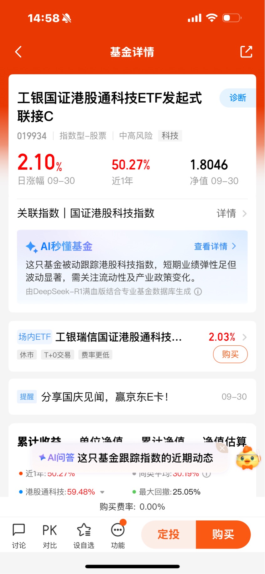 #分享国庆见闻、晒收益、瓜分好礼!#打卡第八天,我看好$工银国证港股通科技ETF发起式联接C$长期投资价值。