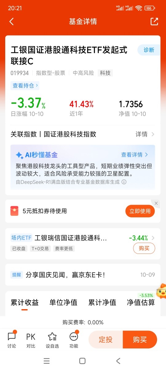 今天这10月10日可真是个“黑色星期五”,港股直接一片“港红”,看得不少股民心里发凉。收盘一瞅,恒生指数跌了1.73%,更狠的是恒生科技指数,直接砸了3.27%,创下今年以来的最大单日跌幅, $工银国证港股通科技ETF发起式联接C$ 今天也跌了3.37%。