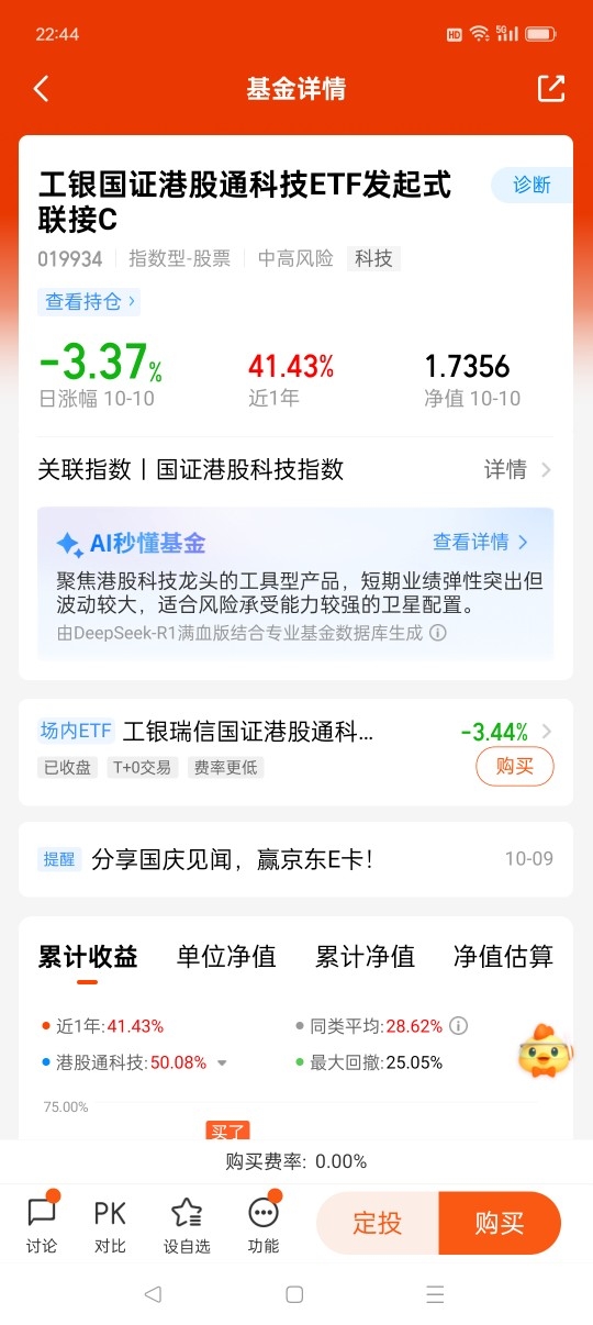 10月12日,星期天,$工银国证港股通科技ETF发起式联接C$近一年收益回报41