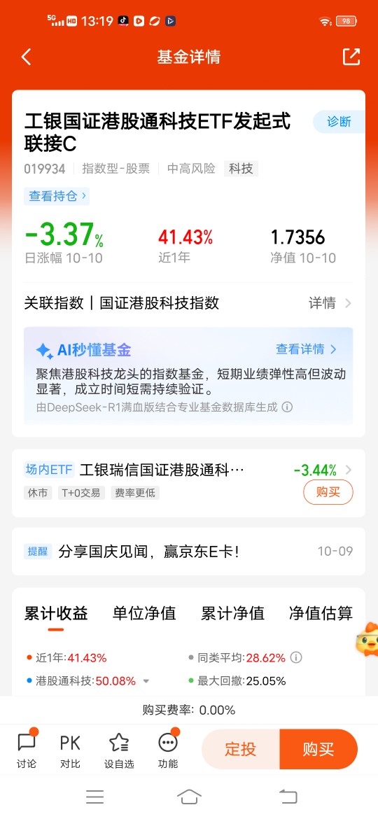 #分享国庆见闻,晒收益,瓜分好礼!# 今天周日,受到突发消息影响,周五美股三大指数大幅下跌,港股市场五连阴,基民小虎觉得出手时候到了!$工银国证港股通科技ETF发起式联接C$ 近一年上涨41.43%,大幅跑赢同类基金28.62%的平均涨幅,在3063只同类基金中排名居前,非常值得关注!