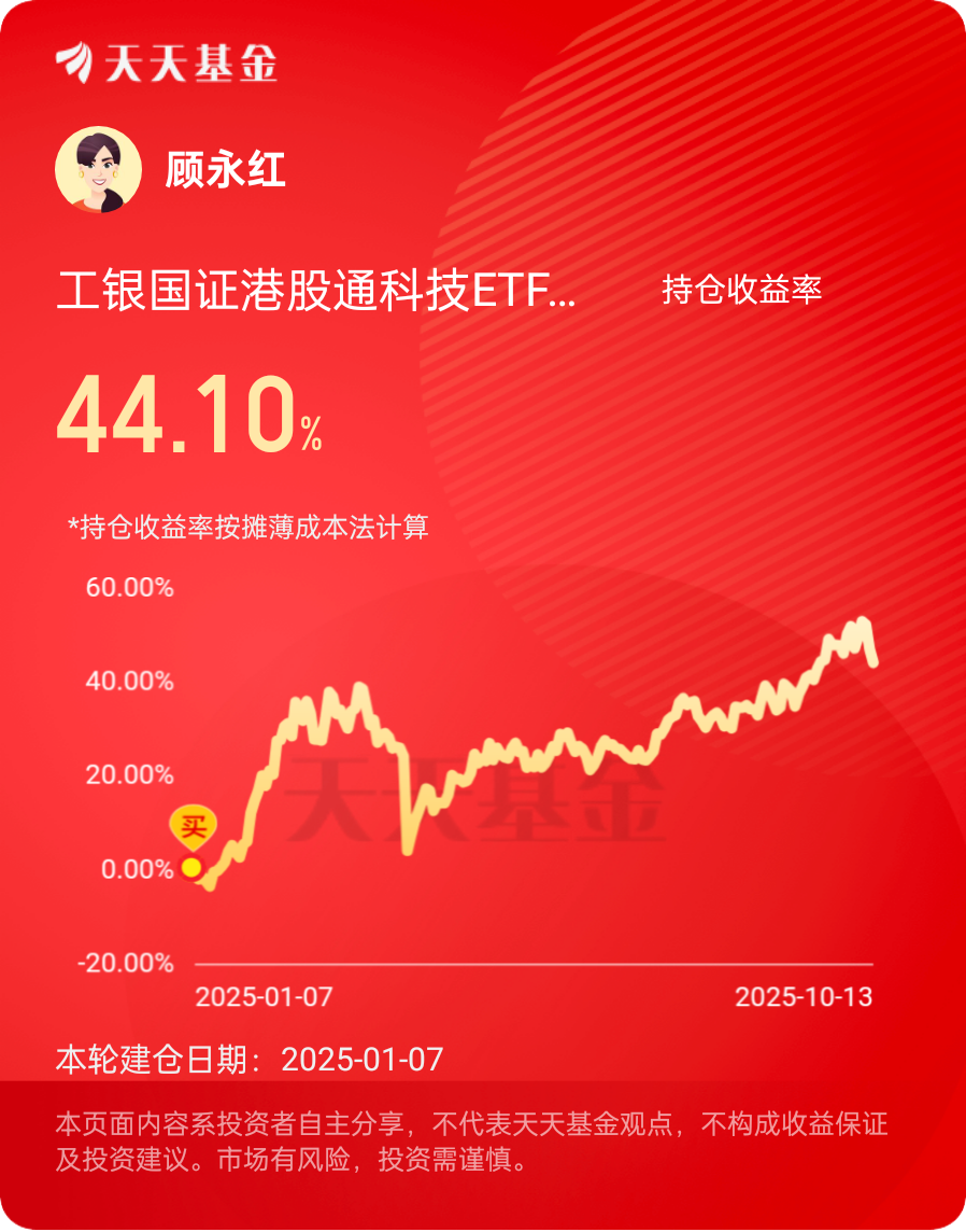 #分享国庆见闻,晒收益,瓜分好礼!#10月13日,星期一,A股市场整体呈现探底回升态势,三大指数收盘跌幅收窄,沪指跌0.19%,收报3889.50点,港股市场也延续回调走势。$工银国证港股通科技ETF发起式联接C$ 今年以来收益回报39.27%(同类基金平均值28.22%),在3418只同类基金中排名居前,表现可圈可点!