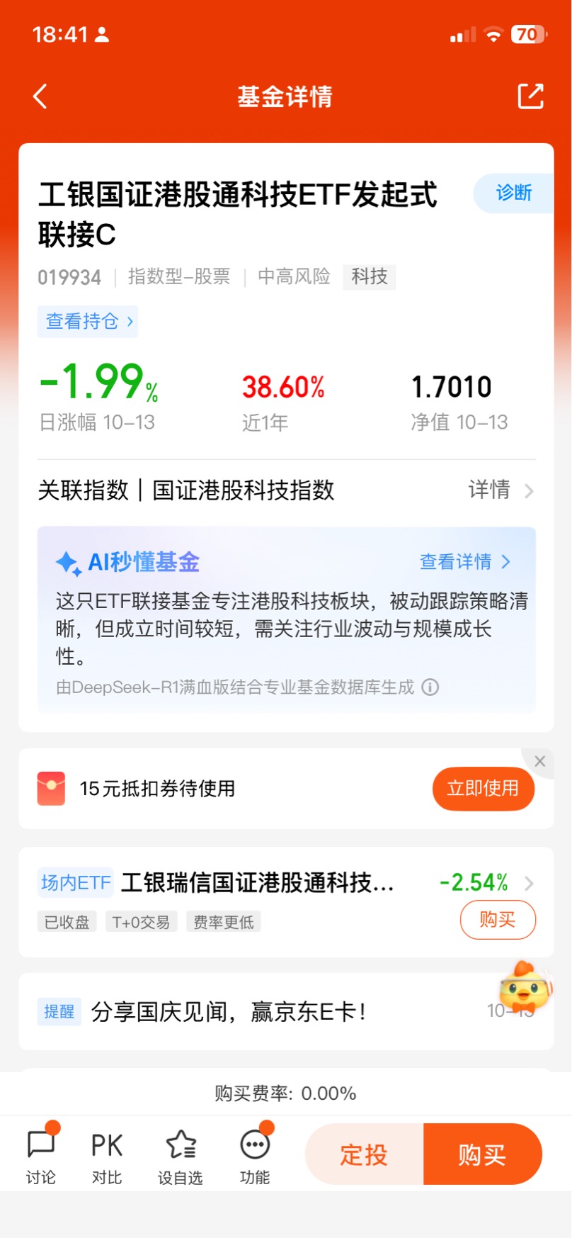 #分享国庆见闻,晒收益,瓜分好礼!# 留言第十九天,$工银国证港股通科技ETF发起式联接C$ 今年以来涨39.27%,在3418只同类基金中排名前列,表现优秀!近期港股市场持续回调,是布局港股科技的很好机会,伙伴们可以持续关注一下。