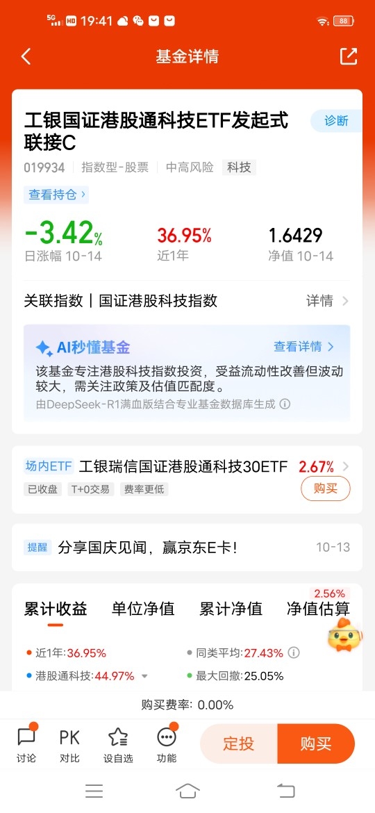 #分享国庆见闻,晒收益,瓜分好礼!#今天周三,今天A股、港股联袂上涨,在全球市场中表现亮眼,有力振奋了国内投资者信心!$工银国证港股通科技ETF发起式联接C$ 今年以来上涨34.51%,跑赢同类基金25.3%的平均涨幅,在3418只同类基金中排名居前,非常棒!今天的大涨走势说明,每次回调都是倒车接人机会。
