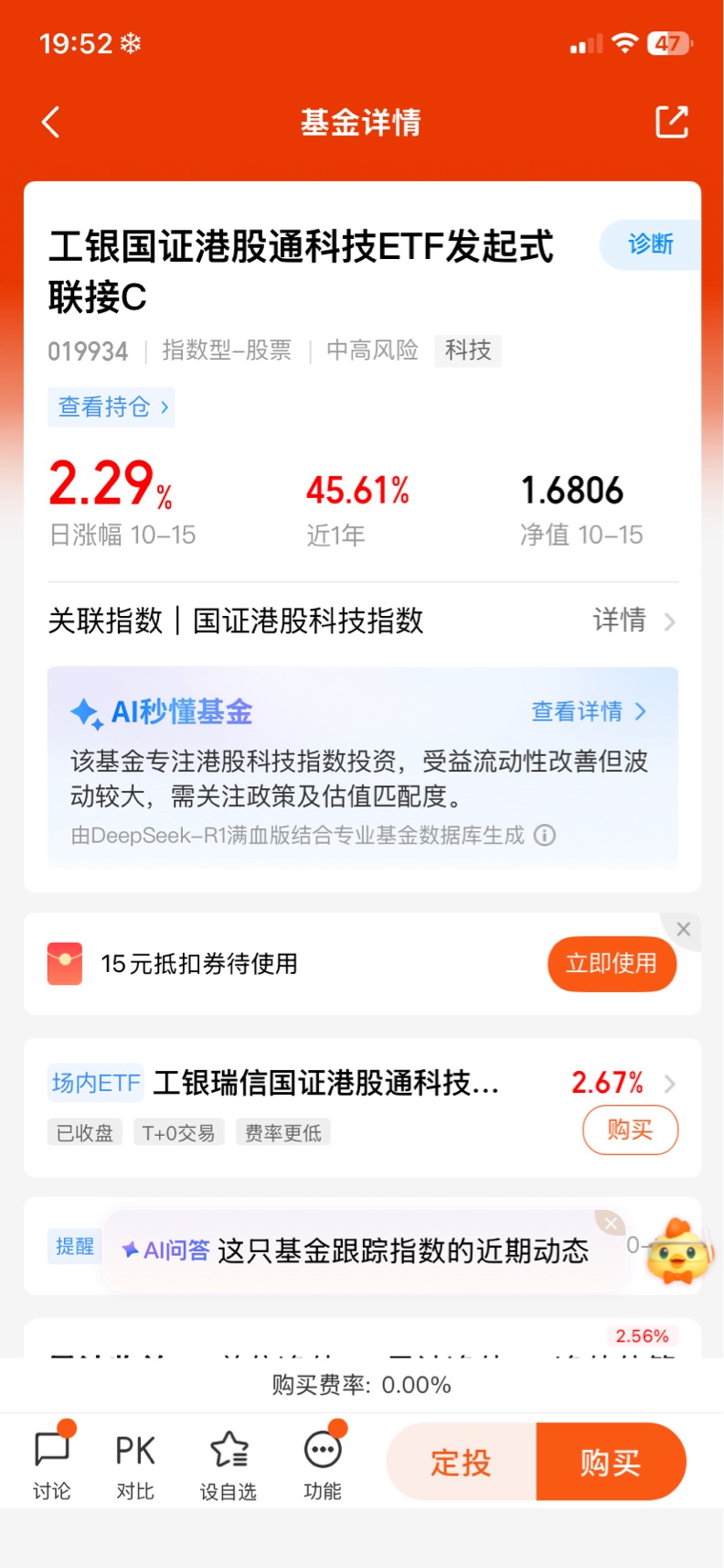 #分享国庆见闻,晒收益,瓜分好礼!# 留言第二十天,今天股市迎来了让投资者开心的大涨行情,国证港股科技指数涨2.54%,布局港股科技投资机会,就选$工银国证港股通科技ETF发起式联接C$ ,近一年涨36.95%,在3065只同类基金中排名前列,表现优秀!