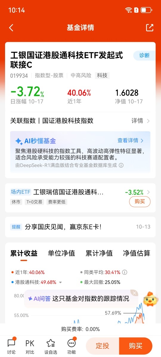 #分享国庆见闻,晒收益,瓜分好礼!# $工银国证港股通科技ETF发起式联接C$ 很特别,它是跟踪港股通科技指数的,简单来说,就是它会买一篮子港股科技股,然后咱们就可以通过买这个基金来间接投资这些股票了。