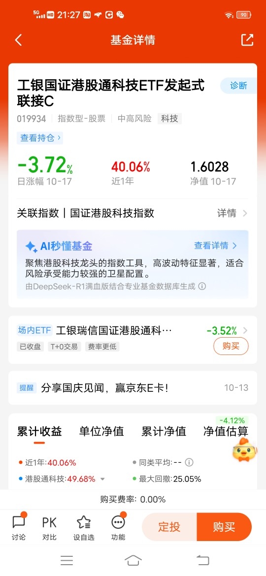 #分享国庆见闻,晒收益,瓜分好礼!# 今天周六,昨天亚太股市全线杀跌,A股、港股主要指数跌1%以上,昨晚美股收涨,恒生指数期货大涨2.54%,$工银国证港股通科技ETF发起式联接C$近一年上涨40.06%,大幅跑赢同类基金30.41%的平均涨幅,在3067只同类基金中排名居前,表现非常棒!非常值得关注!