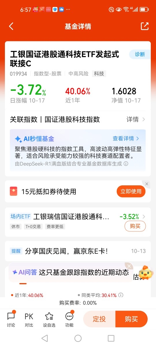 #分享国庆见闻,晒收益,瓜分好礼!#打卡第二十四天。$工银瑞信国证港股通科技ETF发起式联接C(019934)$基金净值自9月30日达到阶段高位净值1.8046之后持续下跌,截至10月17日该基金基金净值调整到1.6026,已累计调整-11.19%。国证港股通科技指数港股市场因外资持股占比高、交易机制与国际市场接轨。其指数表现相较于A股,对美股走势及外资对中国资产的配置态度更为敏感。
