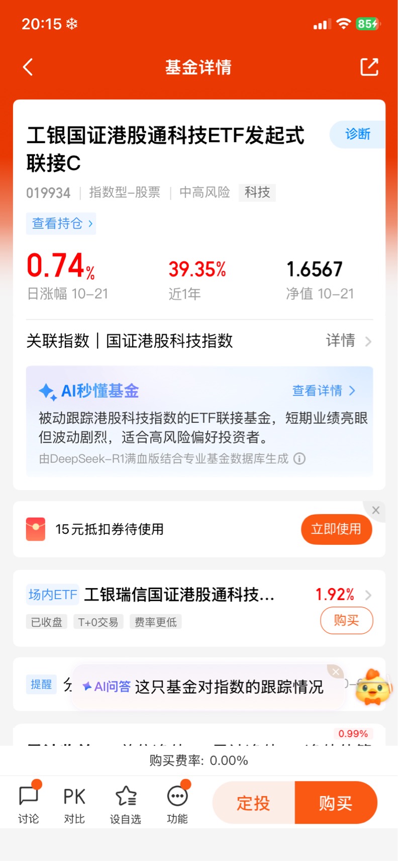 #分享国庆见闻,晒收益,瓜分好礼!# 留言第二十六天,今天A股港股市场继续反弹,上周五跌的又涨回来啦。$工银国证港股通科技ETF发起式联接C$ 涨0.74%,今年以来涨35.64%,在3416只同类基金中排名前列,表现非常亮眼!
