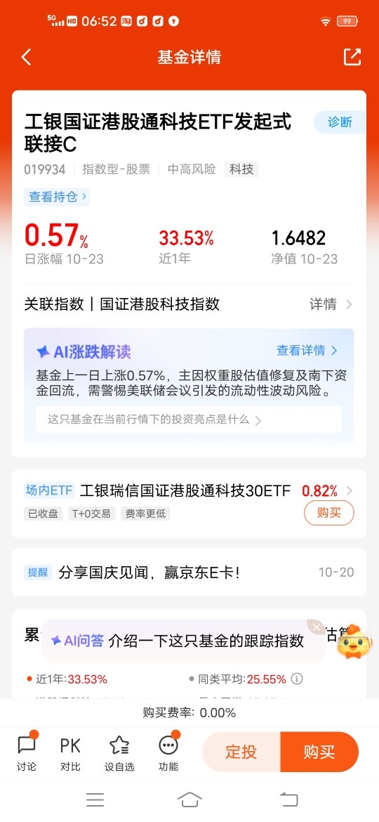 #分享国庆见闻,晒收益,瓜分好礼!# 今天周五,昨天A股、港股市场尾盘拉升,走出深V行情,今天有望继续上涨,$工银国证港股通科技ETF发起式联接C$ 昨天涨0.57%,近一年涨33.53%,大幅跑赢同类基金25.55%的平均涨幅,在3077只同类基金中排名居前,非常棒!值得关注!