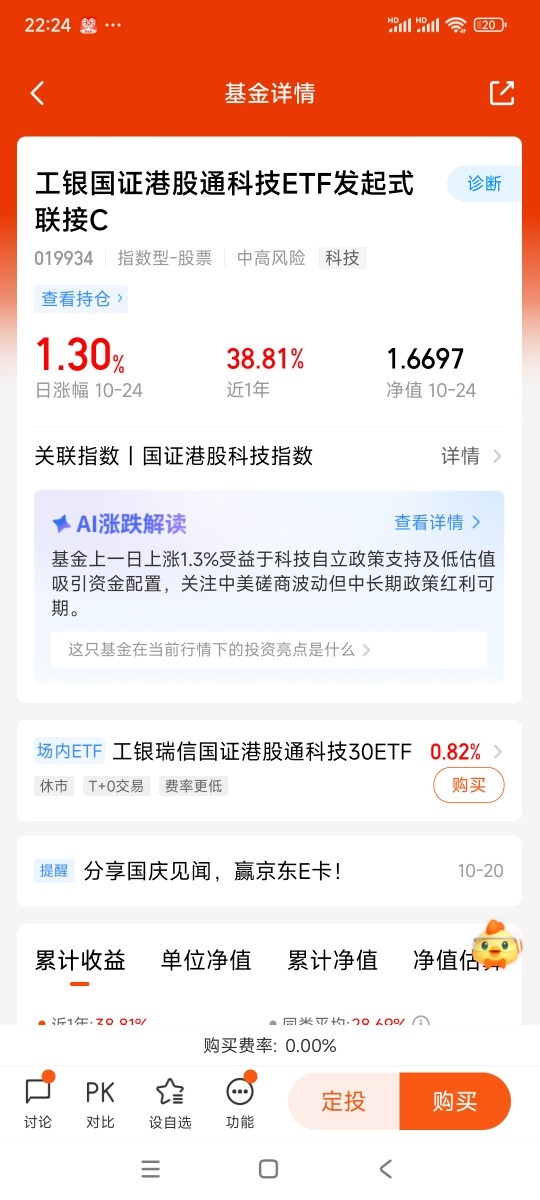 近期国证港股通ETF场内规模增长明显,说明资金都发现了这个指数的投资价值和机会,目前场外唯一跟踪该指数的基金就是$工银国证港股通科技ETF发起式联接C$ ,它网罗科技领域龙头企业,尤其是加入了生物医药科技,让指数下跌后更具备上涨的弹力。