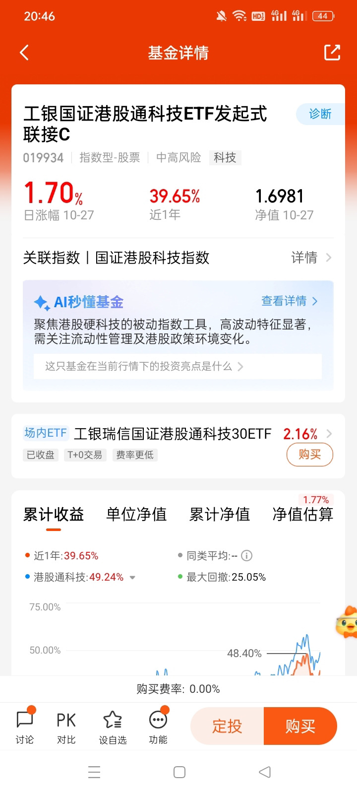 工具选择:我会通过联接基金参与,如$工银国证港股通科技ETF发起式联接C$ ,其综合费率(管理费0.45%+销售服务费0.10%)较主动基金低约60个基点,10元起投,适合我这种小白分散投资。