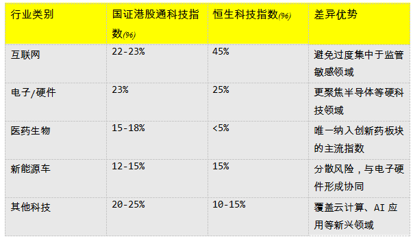 国证港股通科技指数的行业分布设计是其平衡成长性与抗风险能力的关键。该指数通过覆盖创新药、半导体、AI硬件等政策支持的硬科技领域,构建了更具韧性的投资组合。具体来看,国证指数的行业分布呈现以下特点: