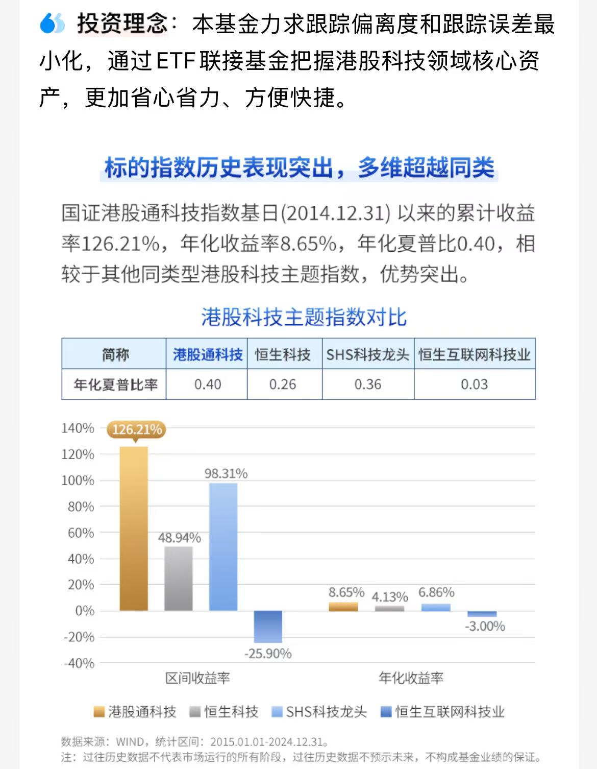 工银国证港股通科技ETF发起式联接C(019934)作为跟踪该指数的工具,凭借低费率结构、稳定的管理团队和发起式基金设计,在同类产品中展现出显著的竞争优势,为投资者提供了布局港股科技板块的理想选择。作为跟踪国证港股通科技指数的工具,具有以下核心优势: