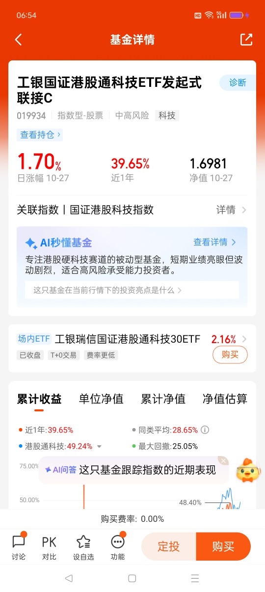 #分享国庆见闻,晒收益,瓜分好礼!# 10月28日,星期二,A股三大指数集体收跌,上证指数收报3988.22点,跌0.22%;港股也出现明显回调,$工银国证港股通科技ETF发起式联接C$ 昨天涨1.7%,今年以来收益回报39.03%(同类基金平均值29.72%),在3416只同类基金中排名居前,超额收益显著!