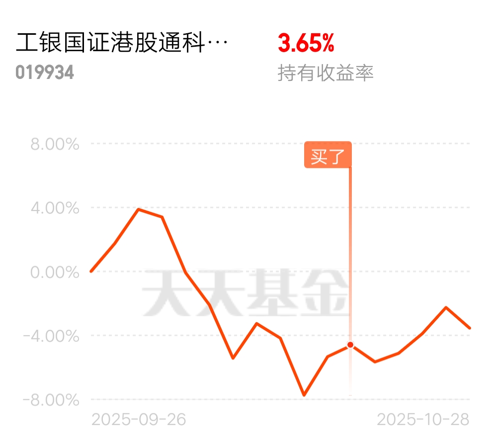 其次,$工银国证港股通科技ETF发起式联接C$ 这只基金也很适合普通投资者,C类份额没有申购费,持有7天免赎回费,操作灵活,而且主要投资于目标ETF,跟踪误差小,虽然中间有小幅波动,但整体趋势向上,更坚定了我长期持有的决心。我打算采用“逢低补仓”的策略,毕竟现在市场环境对港股科技有利,流动性宽松+外资回流+AI进展加速,这都是支撑指数上涨的重要因素。$工银国证港股通科技ETF发起式联接C$