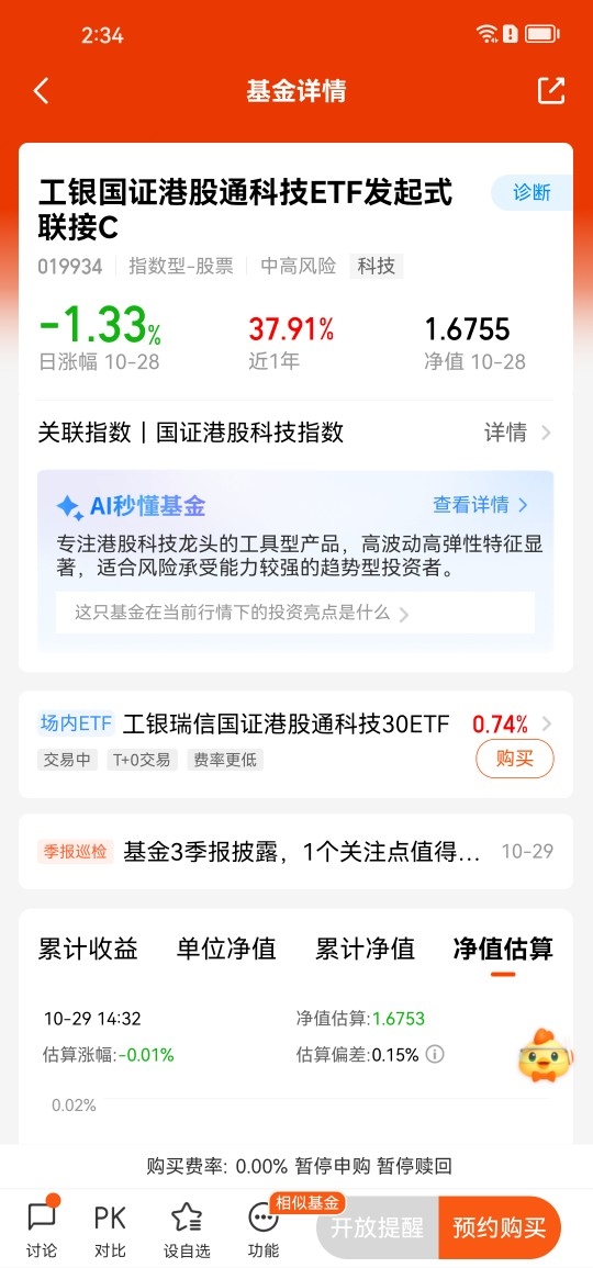 综上所述,工银国证港股通科技ETF发起式联接基金凭借其指数化投资、费率优势及港股科技板块的长期成长性,为投资者提供了高效布局中国科技创新的工具。尽管短期市场波动不可避免,但在人工智能、产业升级及政策红利的推动下,港股科技龙头企业的盈利增长潜力与估值修复空间仍值得期待。对于像我这样风险承受能力较高、追求长期收益的投资者,算是一蛮不错的选择。@工银瑞信基金