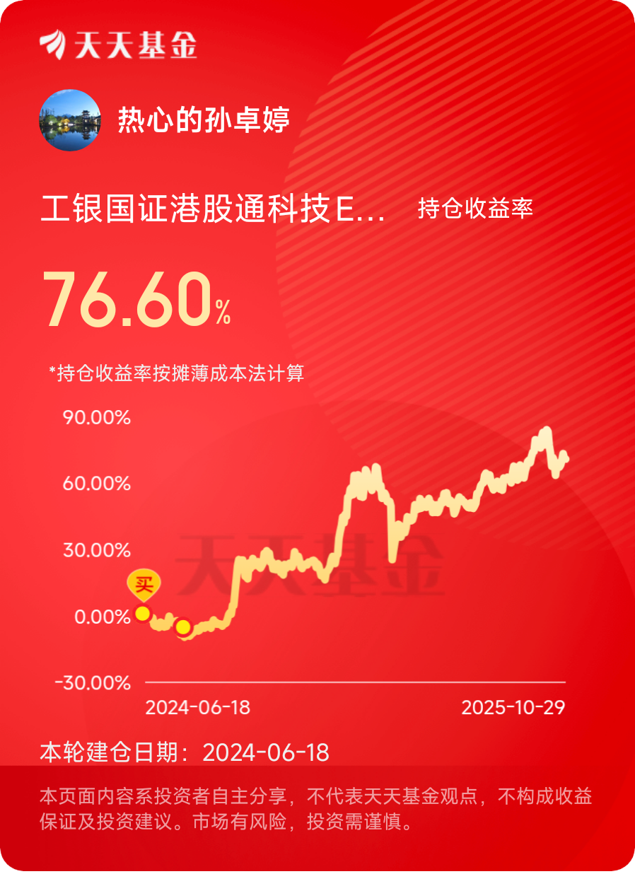 2025年最后三个月,我会继续坚定持有工银国证港股通科技ETF发起式联接C,用每月的工资结余,为自己的未来投票。我相信,随着AI商业化的加速、国产替代的推进,港股科技的价值迟早会被市场认可,而那些坚持长期投资的人,终将收获时间的红利。