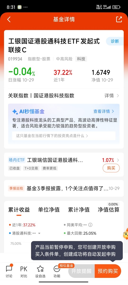 核心持仓:工银国证港股通科技ETF联接C(019934)