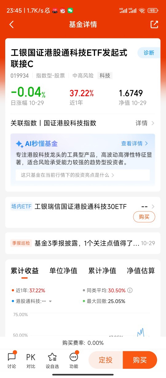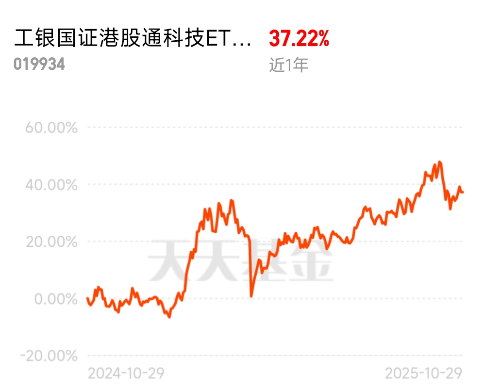 其次,$工银国证港股通科技ETF发起式联接C$ 这只基金也很适合普通投资者,C类份额没有申购费,持有7天免赎回费,操作灵活,而且主要投资于目标ETF,跟踪误差小,虽然中间有小幅波动,但整体趋势向上,更坚定了我长期持有的决心。我打算采用“逢低补仓”的策略,毕竟现在市场环境对港股科技有利,流动性宽松+外资回流+AI进展加速,这都是支撑指数上涨的重要因素。$工银国证港股通科技ETF发起式联接C$