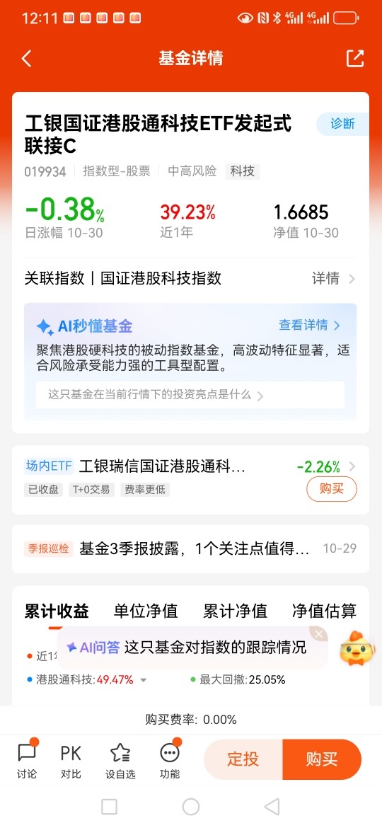 港股的科技公司绝对是个顶个的出色,排前面的那些,每天都掌管着我们的衣食住行。加上港股创新药热度持续,头部企业的业绩也是非常亮眼。这些都推动着港股通科技指数的稳步向上。 普通人选个基是很难的,我还是喜欢养指数鸡,$工银国证港股通科技ETF发起式联接C$ 我一直有在关注着的,无论是基金规模,还是跟踪的紧密度,都很不错。而且我觉得普通投资者还是选择场外基金靠谱,不会因为盘中某一时间点,头脑一热,冲动了。而且场外鸡操作起来还是更简单些!