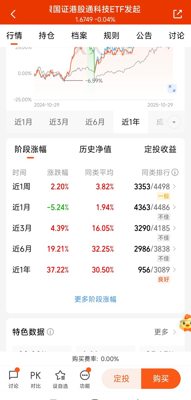 作为指数基金,虽无法主动择时,但通过成分股分散化和权重约束(个股权重上限15%),天然降低了个股“黑天鹅”冲击。基金跟踪的指数年化波动率约15%,低于同类平均18%,背后是行业均衡布局(互联网47.92%、汽车22.03%、医药17.43%),避免单一行业暴露出极端风险。下行风险控制上,基金经理赵栩在操作中注重平稳建仓,如分段买入而非一次性“打满”,以规避港股无涨跌幅限制的瞬时波动。此外,基金作为联接产品,主要投资于场内ETF(工银港股通科技30ETF),后者规模超350亿元,流动性充足,减小了申赎带来的净值偏离。对于普通投资者,这种“低波动+控回撤”特性,能提升持有信心,避免因情绪化操作错失长期收益。