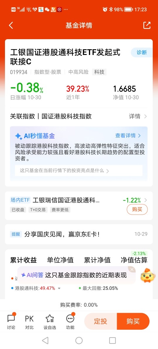 #分享国庆见闻,晒收益,瓜分好礼!# 看好$工银国证港股通科技ETF发起式联接C$ ,近期港股通科技领跑港股,主要是国证港股通科技指数还涵盖生物科技,创新药连续反弹上涨,且龙头权重更高,弹性更强!看好港股通科技指数,超越恒生科技等同类科技主题指数,目前估值低,港股通上市科技公司基本面良好!投资港股科技可以投资工银瑞信国证港股通科技,重点关注港股通科技板块,打造基本面量化投资策略,追求超额收益,基金经理赵栩管理业绩优秀。通过基金买港股,获取收益,近期即使回调,是当下不错的选择。@工银瑞信基金