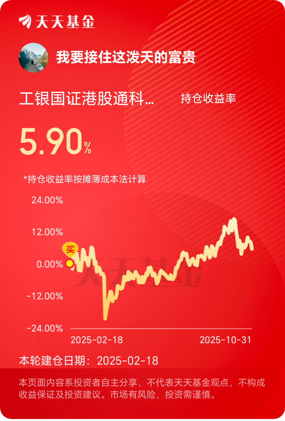 #分享国庆见闻,晒收益,瓜分好礼!# 港股科技走势,预计呈现“震荡上行”格局。短期来看,外部环境改善带来利好:美联储降息周期持续深化,10月可能再次降息,有助于缓解港股流动性压力,历史经验显示,宽松周期中科技股通常表现更优。内部因素方面,AI技术迭代加速,腾讯、阿里等成分股资本开支增速达30%-40%,推动大模型商业化落地。估值上,指数当前市盈率处于上市以来35%分位,尽管今年涨幅已超50%,但距离2021年高点仍有空间,存在均值回归动力。关税摩擦等事件可能引发市场波动,但此类冲击多为阶段性因素,随着APEC会议等沟通机制启动,市场情绪有望逐步修复。整体来看,指数在业绩增长(2026年预测营收增速仍超20%)、资金流入(南向资金年度净流入创纪录)和政策支持(科技自立自强国家战略)三重驱动下,未来三个月有望实现估值与业绩的“双击”。2025年最后三个月,考虑到指数可能延续震荡,我将优先采用定投策略,每月固定日期执行买入,以平滑成本。若因外部风险导致单日跌幅超过3%,则追加一笔投资,单次加仓不超过总仓位的15%。在仓位管理上,目标是将工银国证港股通科技ETF联接基金的持仓提升至总投资额的10%-15%,作为组合的进攻部分。为控制回撤,结合技术指标辅助决策,例如当指数跌破30日均线时暂停加仓,待企稳恢复后再行操作。注重组合对冲,将10%-20%资金配置于货币基金或国债逆回购,保持流动性。每月末进行定期复盘,评估持仓与市场关键变量(如美联储议息、国内经济数据),及时优化策略。国证港股通科技指数,代表了中国科技核心资产的演进方向。指数编制高度聚焦龙头,前十大成分股权重超过75%,覆盖腾讯、阿里等世界级企业,这些公司不仅是互联网巨头,更转型为AI核心资产,旗下大模型如通义、混元等已跻身全球前列。产业布局上,指数均衡覆盖软件服务(占比60%)与硬件半导体(占比40%),并通过纳入智能汽车、生物科技等领域,把握科技融合趋势。资金属性方面,成分股均为港股通标的,直接受益于南向资金流入(年内净流入1.17万亿港元),降低了外资流动的干扰。ETF联接基金费率较低(管理费0.45%),支持小额灵活投资,适合长期积累。科技自立自强已成为国家战略,从AI芯片到创新药出海,指数成分股正是这些变革的重要载体。长期持有不仅是分享企业成长红利,更是参与中国科技价值重估的历史进程。
